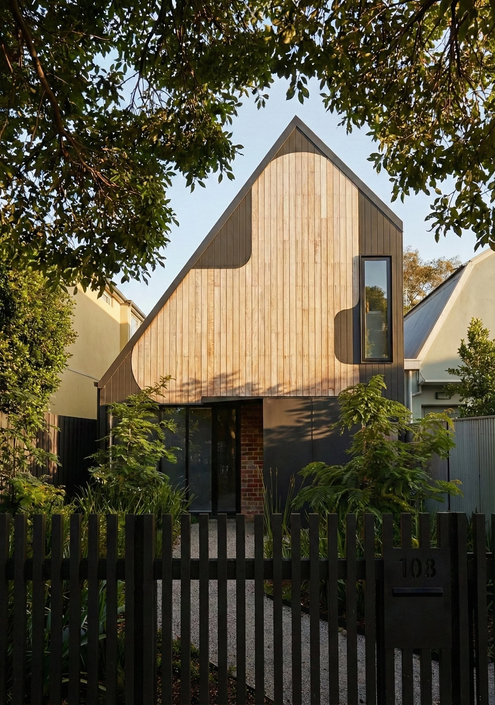 The angle of the battens is generated by following the pitch of the old house roof. Though not the same building, or the same materials, it's the same pitch with battens all running in the same direction to create a visual language, a discussion and shared DNA. Building a two story addition creates the problem of overlooking and the battens solve this issue. The continuation of the battens is carried down to as a continuous form, to read as a flat facade.