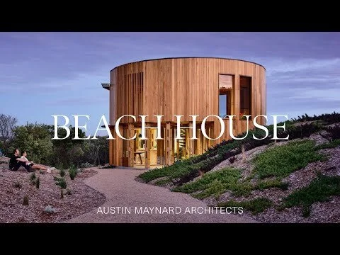 St Andrews Beach House stands at less than five metres in radius, creating a very small footprint amongst the dunes. Like all of Austin Maynard Architects buildings, sustainability is at the core of this project. The materials used are robust and designed to weather. Passive solar principals are maximised by the design. All windows are double-glazed. Solar panels with micro-inverters cover the roof providing electric hydronic- no fossil fuels, no gas. A large cylinder concrete water tank collects rainwater, captured and reused to flush toilets and water the garden.